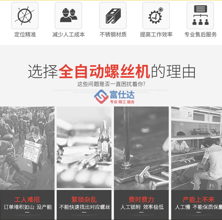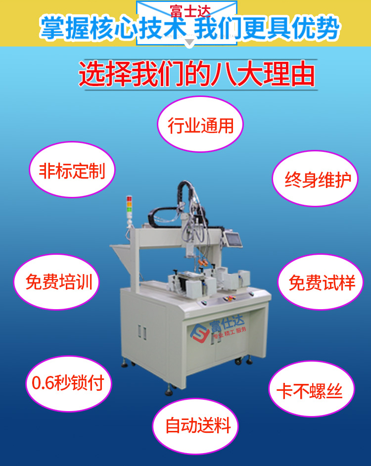 富仕達(dá)擁有獨(dú)立研發(fā)設(shè)計(jì)團(tuán)隊(duì),200多位自動(dòng)化高級(jí)工程師,5000㎡自動(dòng)鎖螺絲機(jī)生產(chǎn)、測(cè)試車間,專業(yè)售后服務(wù)團(tuán)隊(duì),為客戶提供方案設(shè)計(jì)、設(shè)備制造、操作培訓(xùn)、售后服務(wù)等一站式服務(wù)。 公司將持續(xù)提升技術(shù)創(chuàng)新和產(chǎn)品服務(wù)方面的優(yōu)勢(shì),堅(jiān)持“專業(yè)、精工、服務(wù)”的企業(yè)理念,聚焦于自動(dòng)鎖螺絲設(shè)備生產(chǎn),通過系統(tǒng)的一站式解決方案,真正的幫助客戶提升效率、降低成本,提升客戶的核心競爭力。