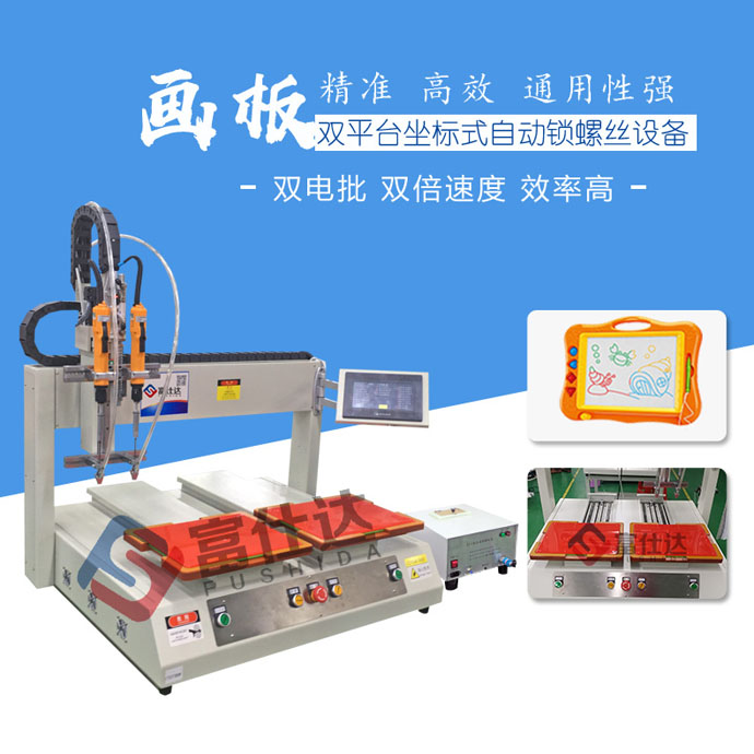 兒童畫板自動(dòng)鎖螺絲機(jī)采用富仕達(dá)雙平臺坐標(biāo)式,配置2把電批一次同時(shí)擰好2顆螺絲,效率提升2倍,設(shè)計(jì)可調(diào)式夾具,滿足多產(chǎn)品生產(chǎn)要求。