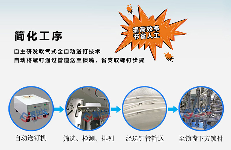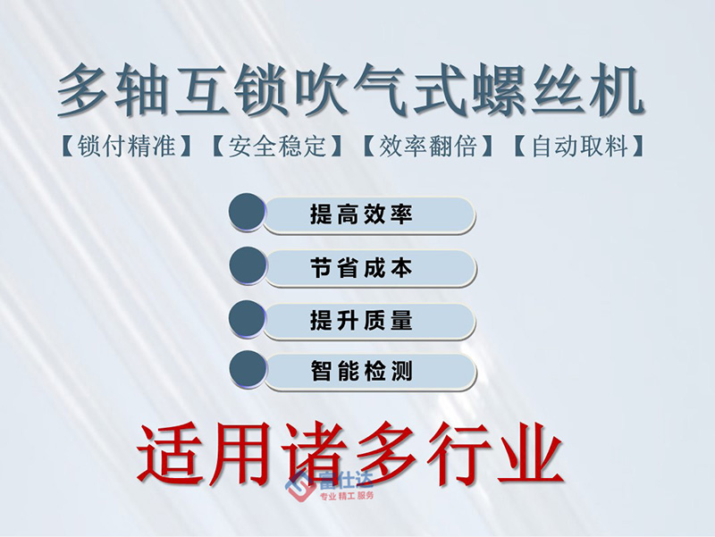 該鎖付系統(tǒng)可等同為全自動(dòng)鎖螺絲流水線,通過四個(gè)工作站的作業(yè),將百葉窗扇葉通過螺絲緊固在框架內(nèi)的指定位置,螺絲采用自主研發(fā)吹氣式自動(dòng)送釘機(jī),直接輸送至鎖付機(jī)構(gòu);扇葉通過專用治具與框架定位,需手動(dòng)放置;鎖付系統(tǒng)采用水平雙方向同時(shí)作業(yè),配置4把電批位于兩側(cè),一次擰好4顆螺絲;移動(dòng)式作業(yè)臺(tái)根據(jù)程序設(shè)定,逐點(diǎn)向前推進(jìn)并自動(dòng)擰螺絲。